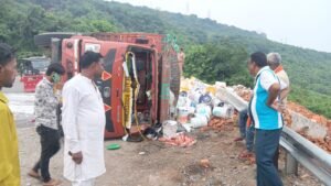 *मारकुंडी घाटी में पेंट से भरी डीसीएम पलटी, बड़ा हादसा टला – ड्राइवर व खलासी सुरक्षित*