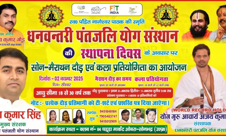 धनवंतरी पतंजलि योग संस्थान की स्थापना दिवस के अवसर पर योग,आयुर्वेद मैराथन एवं कला प्रतियोगिता का आयोजन 2 नवम्बर 2025 दिन रविवार को प्रातः 7 बजे से क्लब नम्बर 4 ओबरा में होना सुनिश्चित किया गया है । संस्थान के संस्थापक सदस्य योग गुरु आचार्य अजय पाठक एवं कार्यक्रम अध्यक्ष आयुष बंसल ने कहा कि उत्तर प्रदेश में योग एवं आयुर्वेद की जन क्रांति को जन-जन तक पहुचने के लिए पहली बार *सोन योग मैराथन* के जरिये युवा पीढ़ियों को स्वास्थ्य क्रांति के प्रति जागरूक किया जायेगा।आज कल की युवा पीढ़ी सिर्फ फोन एवं इंटरनेट से शारीरिक श्रम को भूलते जा रहे है ।कला प्रतियोगिता के माध्यम से प्रदेश के सोनभद्र जिले के मूल निवासी को अपनी हुनर को दिखाने एवं कलाकृतियों- चित्र के माध्यम से सम्पूर्ण भारत मे अपने हुनर को दिखाने के लिए *भव्य कला प्रतियोगिता* का आयोजन में भारत की विकसित व्यवस्था ,शहीदों की कलाकृतियों ,सोनभद्र की धार्मिक एवं ऐतिहासिक स्थल कीकलाकृतियों से यहां की वीर गाथायो को चित्र के माध्यम से सम्पूर्ण राष्ट्र तक पहुचाने का कार्य इन सभी प्रतियोगिता के माध्यम से किया जाना है । कार्यक्रम के मुख्य संरक्षक रमेश सिंह ने कहा कि धनवंतरी पतंजलि योग संस्थान की स्थापना दिवस के अवसर पर दौड़ प्रतियोगिता से युवाओं को स्वस्थ रहने एवं कला प्रतियोगिता से उत्तर प्रदेश सोनभद्र की प्राचीनतम कलाकृतियों का चित्रण कर अपनी संस्कृति को पहचाने का कार्य होगा ।संस्थान की स्थापना दिवस पर विभिन्न प्रदेश उत्तराखंड, उत्तर प्रदेश,मध्य प्रदेश, झारखंड, छत्तीसगढ़, उड़ीसा, हरियाणा, दिल्ली, हिमाचल प्रदेश, राजस्थान के सभी सदस्यों की उपस्थिति होनी है ।यह सूचना कार्यक्रम प्रभारी एवं उत्तर प्रदेश प्रभारी आयुष बंसल ने दी है ।