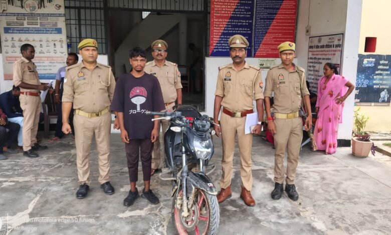 पुलिस अधीक्षक अभिषेक वर्मा के निर्देशन में चोरी की घटनाओं पर अंकुश लगाने व चोरी की घटनाओं का शीघ्र अनावरण व उसमें संलिप्त अपराधियों की गिरफ्तारी हेतु चलाये जा रहे अभियान के क्रम में पुलिस अधीक्षक मुख्यालय अनिल कुमार के पर्यवेक्षण व क्षेत्राधिकारी नगर रणधीर मिश्रा के नेतृत्व बुधवार को थाना चोपन पुलिस द्वारा डाला क्षेत्र में भ्रमण व नवरात्रि के दृष्टिगत संदिग्ध व्यक्तिों एवं वाहनों की चेकिंग के दौरान डाला ओबरा संपर्क मार्ग पर स्थित अल्ट्राटेक के पीछे वाले गेट रेक्सहवा डाला थाना चोपन से अभियुक्त विनोद बैगा पुत्र लाल बहादुर निवासी ग्राम चुनरिया उम्र करीब 22 वर्ष को गिरफ्तार किया गया, जिसके कब्जे से चोरी की एक अदद टीवीएस अपाची मोटर साइकिल बरामद किया गया। उक्त गिरफ्तारी व बरामदगी के सम्बन्ध मे थाना चोपन पर मु0अ0सं0-330/25 धारा 317(2) बीएनएस अभियोग पंजीकृत कर विधिक कार्यवाही कर न्यायालय भेजा गया।