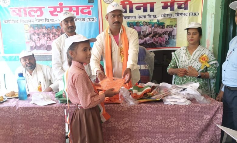 म्योरपुर ब्लॉक के कंपोजिट विद्यालय नेमना में बुधवार को एक समारोह का आयोजन कर बाल संसद,इको क्लब, और मीना मंच के पदाधिकारियों को कर्तव्य और दायित्व का शपथ दिलाया गया। कार्यक्रम का शुभारंभ स्वागत गान से हुआ। मुख्य अतिथि ग्राम प्रधान प्रतिनिधि राधेश्याम और विद्यालय प्रबंध समिति अध्यक्ष लाले राम द्वारा बच्चों को टी शर्ट, कैप और सेस पहना कर मनोनीत पदाधिकारियों को दायित्व और कर्तव्यनिष्ठा की शपथ दिलाया गया। विद्यालय की छात्रा रंजना बाल संसद की प्रधानमंत्री और अम्बा