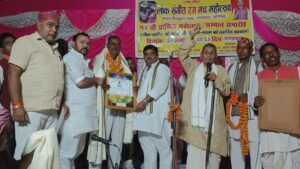 सिद्ध सन्त पण्डित शीतला प्रसाद शुक्ल चिर स्मृति सम्मान से सामाजिक गतिविधियों में सतत सन्नद्ध पूर्व जिलापंचायत सदस्य अमरनाथ सिंह चौधरी अंगवस्त्र , स्मृतिचिन्ह , सम्मान पत्र सँग सपात्र नारिकेल अर्पित कर सम्मानित हुए तो भोजपुरी कविसम्राट मुंशी मंगल लाल चिर स्मृति सम्मानित किया गया कवि परमहंस सिंह चंदौली को। द्वय विभूतियों को ब्लाकप्रमुख संजय सिंह एवं जिलापंचायत सदस्य नीरज कुमार श्रीवास्तव ने क्रमशः उत्तरीय व सपात्र नारिकेल सँग स्मृतिचिन्ह व उनके नाम उत्कीर्ण सम्मानपत्र समर्पित किये। इनके साथ सम्मान श्रृंखला अग्रसर रहा जहां मंच पर ब्लॉकप्रमुख संजय यादव एवं जिलापंचायत सदस्य नीरज कुमार श्रीवास्तव को आयोजकमण्डल ने अंगवस्त्र , स्मृतिचिन्ह व सपात्र नारियल भेंट कर सम्मानित किया। इसी कड़ी में कुछ अन्य लोग भी सम्मानित किए गए। सक्रिय योगदान अर्पित करते मंचस्थ रहे समिति के अध्यक्ष मुन्नर यादव व संरक्षक डॉ0 परमेश्वर दयाल श्रीवास्तव “पुष्कर” ।