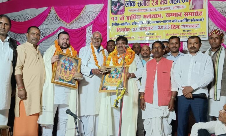 घोरावल /शिवशक्ति लोक रंगमंच महोत्सव की बिखरी दिव्य छटा , शिवद्वार में लोकगीत , लोकनाट्य , गायन – वादन की बही रसधार । दीपावली के अगले दिवस सन्ध्या वेला से शुरू महोत्सव में मानद विभूतियों के नाम उनकी स्मृति में आयोजित हुआ सम्मान समारोह भी। विलुप्त होती सोनभद्र की सांस्कृतिक लोकविधाओं की जीवन्त प्रस्तुतियों से गुलजार रंगमंच पर अन्य विविध विधाओं से रात्रि भर व सुबह तक चला महोत्सव।