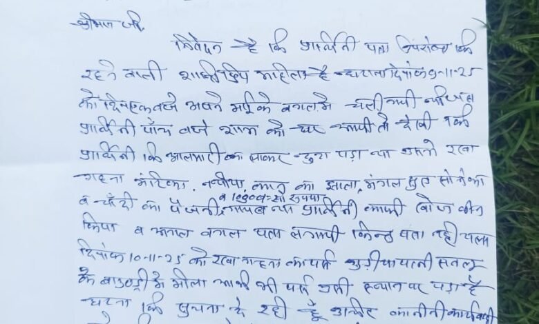 इस संबंध में मंगलवार को चोपन थाने में दिए गए लिखित तहरीर में सलखन ग्राम पंचायत के सूईया टोला निवासी पीड़िता इमराना पत्नी अब्दुल हमीद ने बताया है कि बीते दिनांक 9 नवंबर 2025 दिन रविवार को वह पास ही में स्थित मायके चली गई थी कि घर के अंदर अलमारी में रखा मांग टीका, नथिया,कान का झाला सोने का मंगलसूत्र,चांदी का पायजनी तथा नगदी ₹10000 लाकर तोड़कर चोर चुरा ले गये। पीड़िता ने काफी खोजबीन किया लेकिन कहीं अता-पता तथा कोई सुराग नहीं मिल सका। दूसरे दिन पड़ोसी के घर में आभूषण के कुछ गहने गिरे मिले दिखाई दिये। पीड़िता नहीं संबंध में चोपन थाने में लिखित नामजद तहरीर देकर उचित कार्रवाई किए जाने की मांग की है।
