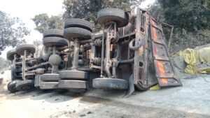 बीजपुर-रेणुकूट मुख्य मार्ग पर बुधवार की रात उस समय अफरा-तफरी मच गई, जब राखड़ लदा एक हाइवा अनियंत्रित होकर सड़क के बीचों-बीच पलट गया। हादसे के कारण सड़क पर चारों ओर राख फैल गई, जिससे आवागमन पूरी तरह बाधित हो गया और मार्ग पर वाहनों की लंबी कतारें लग गईं।प्राप्त जानकारी के अनुसार, एनटीपीसी रिहंद नगर के राख बांध से राख लोड कर एक हाइवा बुधवार की शाम छत्तीसगढ़ के अंबिकापुर की ओर जा रहा था। जैसे ही वाहन जरहा गांव के समीप पहुंचा, चालक नियंत्रण खो बैठा और हाइवा मुख्य मार्ग के बीचों-बीच पलट गया।​हादसा होते ही आसपास के ग्रामीण और राहगीर मदद के लिए दौड़ पड़े। लोगों ने कड़ी मशक्कत के बाद केबिन में फंसे चालक को सुरक्षित बाहर निकाला। हालांकि, बाहर निकलते ही चालक अंधेरे का फायदा उठाकर मौके से भागने में सफल रहा।​सड़क पर राख फैलने के कारण भारी वाहनों के पहिए थम गए। रात भर बड़ी गाड़ियां सड़क पर खड़ी रहीं, जिससे यात्रियों को काफी परेशानियों का सामना करना पड़ा। कुछ छोटी गाड़ियों और बाइक सवारों ने तो ग्रामीण रास्तों का सहारा लेकर अपनी मंजिल तय की, लेकिन ट्रक और बसें समाचार लिखे जाने तक जाम में फंसी रहीं।​प्रभारी निरीक्षक नरेंद्र कुमार सिंह ने कहा कि हाइवा और सड़क पर फैली राख को हटवाने की प्रक्रिया शुरू कर दी गई है। क्रेन की मदद से वाहन को किनारे किया जा रहा है। जल्द ही मार्ग साफ कराकर यातायात को सामान्य कर दिया जाएगा।