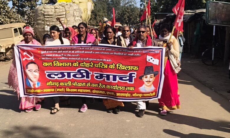 चंदौली जनपद के तहसील नौगढ़ में शुक्रवार को आदिवासियों, दलितों और वनवासियों की पुश्तैनी जमीनों पर वन विभाग द्वारा की जा रही बुलडोजर कार्रवाई के विरोध में भारी जन-आक्रोश फूट पड़ा। भाकपा (माले) के नेतृत्व में सैकड़ों ग्रामीणों ने ‘लाठी मार्च’ निकालकर प्रशासन के खिलाफ हुंकार भरी और जयमोहनी वन रेंज कार्यालय का घेराव किया।