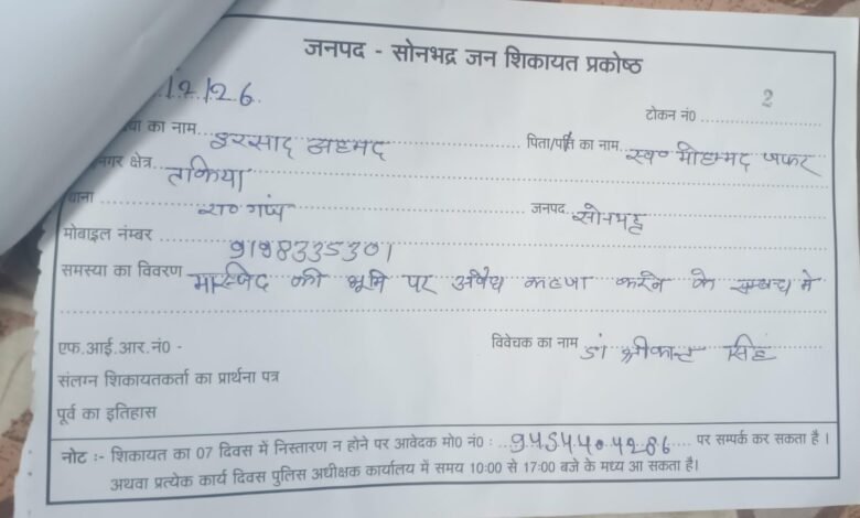 करमा विकासखंड के अंतर्गत ग्राम पंचायत तकिया के ग्रामवासियों द्वारा मस्जिद की राजस्व अभिलेखों में दर्ज भूमि (गाटा संख्या 80, खाता संख्या 00487) पर कराए गए कथित अवैध रोड एवं नाली निर्माण के विरुद्ध सामूहिक रूप से आवाज उठाई गई है।ग्रामवासियों के अनुसार उक्त भूमि खतौनी में मस्जिद/धार्मिक संपत्ति के रूप में दर्ज है, इसके बावजूद वर्तमान ग्राम प्रधान के कार्यकाल में बिना विधिक प्रक्रिया एवं बिना संबंधित पक्ष की सहमति के निर्माण कार्य कराया गया। इस संबंध में पूर्व में IGRS पोर्टल पर शिकायत संख्या 40020026000033 दर्ज कराई गई थी, जिसके क्रम में लेखपाल द्वारा नापी एवं सीमांकन किए जाने की जानकारी दी गई है।प्रार्थना पत्र को स्वीकार करते हुए दिनांक 10/02/2026 को उपजिलाधिकारी राबर्ट्सगंज उत्कर्ष द्विवेदी द्वारा नियमानुसार कार्रवाई हेतु थाना प्रभारी राबर्ट्सगंज को निर्देशित किया गया। 11/02/2026 को थाना राबर्ट्सगंज पर दोनों पक्षों को बुलाकर वार्ता कराई गई।बैठक के दौरान आपसी सहमति नहीं बन सकी। वार्ता के दौरान बहस की स्थिति भी उत्पन्न हुई। प्रार्थी पक्ष का कहना है कि मामले को गंभीरता से उठाने वाले इरशाद अहमद को कुछ व्यक्तियों द्वारा कथित रूप से धमकियां दी गईं।थाना प्रभारी द्वारा दोनों पक्षों को आगामी थाना दिवस (शनिवार) को पुनः उपस्थित होकर अपने-अपने अभिलेख एवं साक्ष्य प्रस्तुत करने के निर्देश दिए गए हैं।प्रार्थीगण का कहना है कि यह प्रकरण उत्तर प्रदेश राजस्व संहिता, 2006 की धारा 67 (अवैध अतिक्रमण हटाने संबंधी प्रावधान), वक्फ अधिनियम, 1995 के प्रावधानों तथा भारतीय दंड संहिता की संबंधित धाराओं के अंतर्गत गंभीर विषय है। यदि भूमि धार्मिक संपत्ति के रूप में दर्ज है, तो उस पर बिना सक्षम अनुमति निर्माण कार्य पूर्णतः अवैध है और दोषियों के विरुद्ध वैधानिक कार्रवाई की जानी चाहिए।