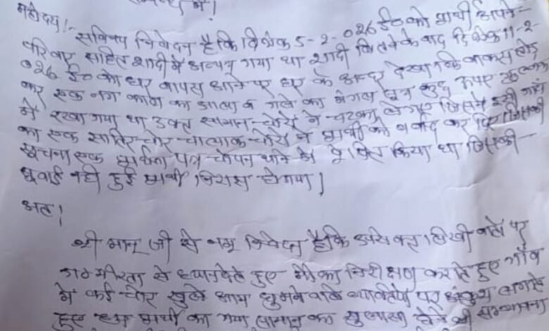 गुरमा-सोनभद्र। चोपन थाना क्षेत्र के सलखन ग्राम पंचायत स्थित मुनगा टोला निवासी अजय कुमार जायसवाल पुत्र रामसनेही ने प्रभारी निरीक्षक को शनिवार को एक लिखित प्रार्थना पत्र देकर अवगत कराया है कि भुक्तभोगी सपरिवार बीते 5 फरवरी 2026 को एक विवाह समारोह में घर के दरवाजे पर ताला लगाकरअन्यत्र गया हुआ था तथा 11 नवंबर2026 को जब घर वापस आया तो देखा कि दरवाजे पर लगा ताला टूटा पड़ा है तथा घर के अंदर गया तो देखा कि बक्से का कुंडी भी टूटा हुआ है जिसमें रखा सोने का एक नग झाला,मंगलसूत्र तथा गुल्लक में रखे नकदी रुपए चोर चुरा ले गए हैं।इस संबंध में भुक्तभोगी समेत परिजनों ने न्याय की गुहार लगाते हुए चोरी का पर्दाफाश किये जाने की मांग की है।