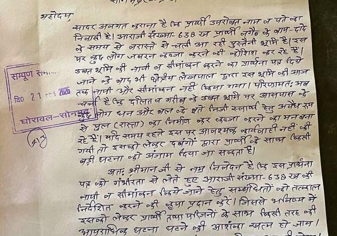 घोरावल तहसील क्षेत्र के ढुटेर गांव में दलित की भूमिधरी जमीन को दबंग कब्जा करने के प्रयास में है। उक्त गांव निवासी ज्ञानदास ने शनिवार को सम्पूर्ण तहसील समाधान दिवस घोरावल में दिये प्रार्थना पत्र में बताया है कि गांव में स्थित उनके आराजी संख्या-638 ख की भूमिमधरी श्रेणी-1 की पुस्तैनी जमीन की नापी व सीमांकन कराये जाने के लिए पूर्व में प्रार्थना पत्र दिया था। लेकिन क्षेत्रीय लेखपाल द्वारा आज तक इस जमीन की नापी और सीमांकन नहीं किया गया। परिणामस्वरूप आसपास के कुछ लोग धन और बल के बूते उक्त पुस्तैनी भूमि पर अवैध रूप से पुल, रास्ता का निर्माण कर जबरन कब्जा करने का मन बना रहे है। ऐसी चर्चा सुनने को मिल रही है। यहि समय रहते इस पर आवश्यक कार्यवाही नहीं की गयी तो भविष्य में दबगों द्वारा किसी आपराधिक घटना को अंजाम दिया जा सकता है। ऐसे स्थिति में उन्होने इस भूमि की तत्काल नापी व सीमांकन कराये जाने का अनुरोध विभागीय उच्चाधिकारियों से किया है। जिससे भूमि स्वामी के साथ दबंगों द्वारा घटना को अंजाम दिये जाने की आशंका खत्म हो जाये और सुकुन से जीवनबसर कर सके।