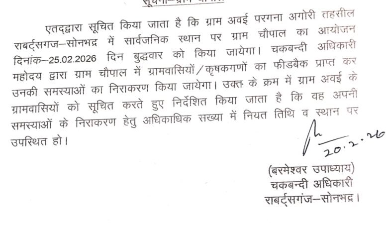 रॉबर्ट्सगंज तहसील क्षेत्र के परगना विजयगढ़ अंतर्गत ग्राम अवई गाँव में चकबंदी अधिकारी बरमेश्वर उपाध्याय द्वारा पच्चीस फरवरी दिन बुधवार सार्वजनिक स्थान पर चौपाल लगाकर किसानों की समस्याओं की सुनवाई कर उसका समाधान किया जायेगा। चकबंदी अधिकारी बरमेश्वर उपाध्याय ने जानकारी देते हुए बताया की शासन के निर्देश पर चकबंदी वाले गाँवों में जन चौपाल लगाकर किसानों की समस्याओं की सुनवाई के लिये तिथि निर्धारित की गई है जहाँ किसान अपनी समस्याएं बताकर उसका निस्तारण करा सकते हैं। उन्होंने बताया की 25फ़रवरी को अवई में किसानों की समस्याओ की सुनवाई की जायेगी । गांव में आयोजित जन चौपाल में वे स्वयं उपस्थित रहकर किसानों की समस्याओं की सुनवाई कर उसका निस्तारण करेंगे। श्री उपाध्याय ने किसानों से अपनी समस्याओं का समाधान कराने की अपील किया है।