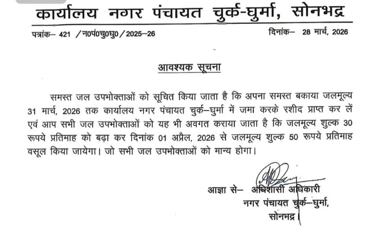गुरमा,सोनभद्र।नगर पंचायत चुर्क घुर्मा के अधिशासी अधिकारी अमित सरोज ने नगर पंचायत के समस्त जल उपभोक्ताओं को अवगत कराया है कि अपना समस्त बकाया जल मूल्य बीते 31मार्च2026 तक कार्यालय नगर पंचायत चुर्क-घुर्मा में जमा करके रशीद प्राप्त कर लें